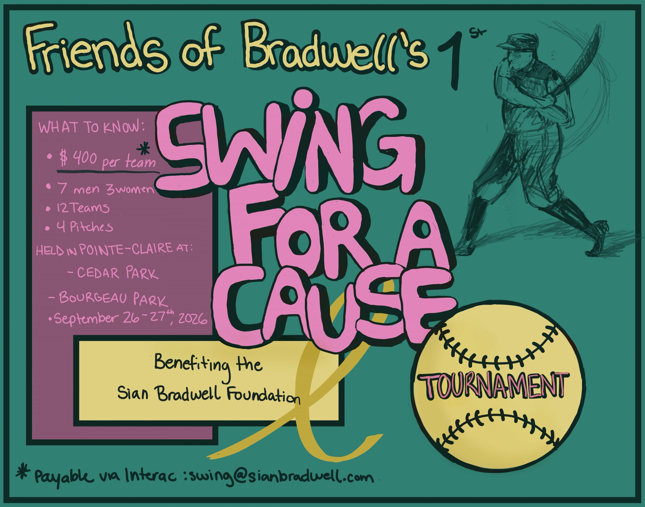 Swing For A Cause Softball Tournament [SFAC] is a fundraiser for priority medical equipment required by the Montreal Children’s Hospital through the Sian Bradwell Fund. For example, there are times when one child with cancer may need up to 3 pumps at a time (chemotherapy drugs, pain medication, hydration), so the Sian Bradwell Fund has undertaken to raise $200,000 for intravenous infusion pumps.
